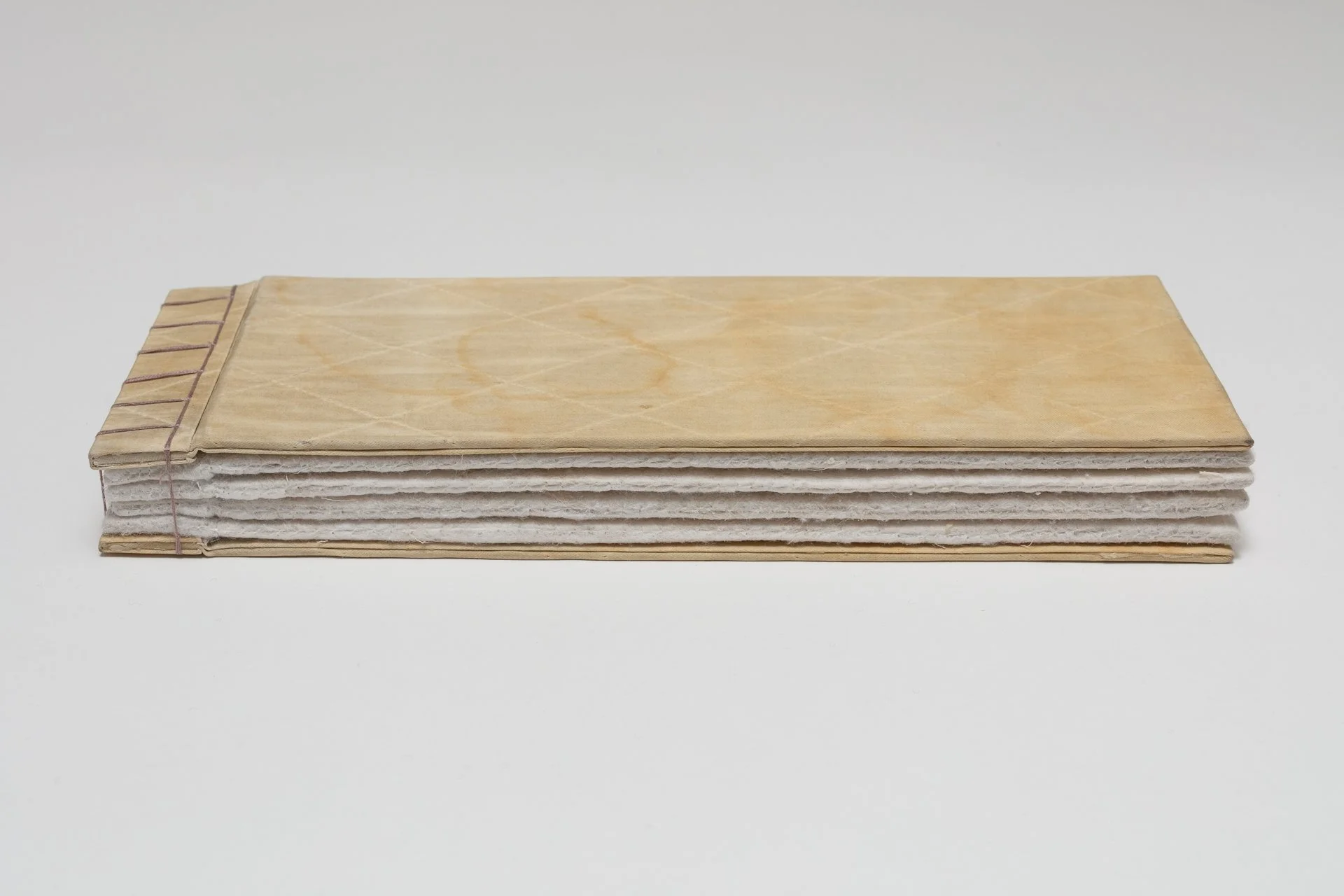 Rest(less) is built primarily from a used pillow: the covers are made from book board covered with the shell of the pillow, while the lining of the pillow became the book’s pages, with a substrate of Arches Cover paper. I utilized the machine-quilted wave pattern from the original lining and stitched over it with embroidery thread; the two narrative lines are also stitched with embroidery thread. The book is bound with embroidery thread in a Japanese stab binding style.