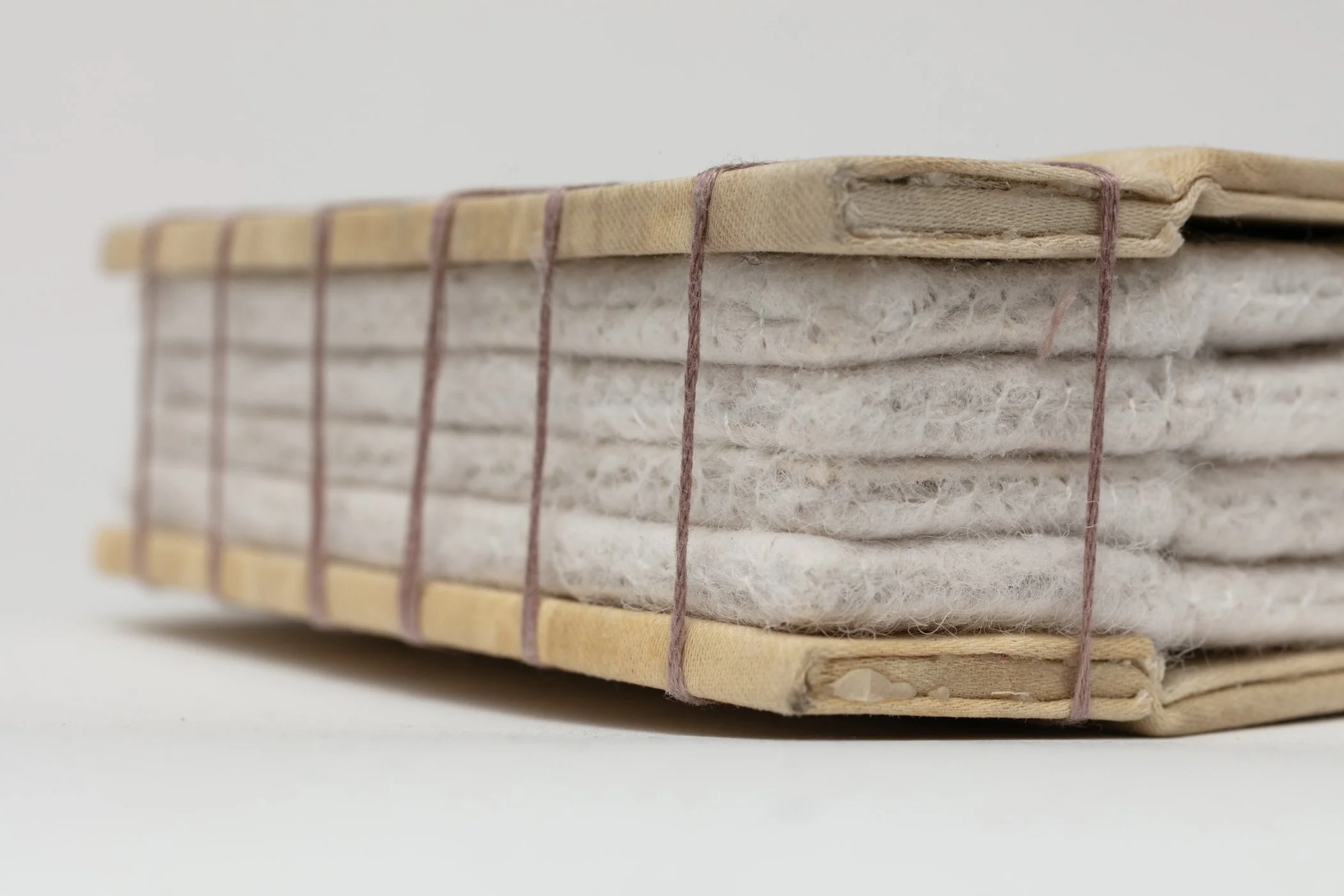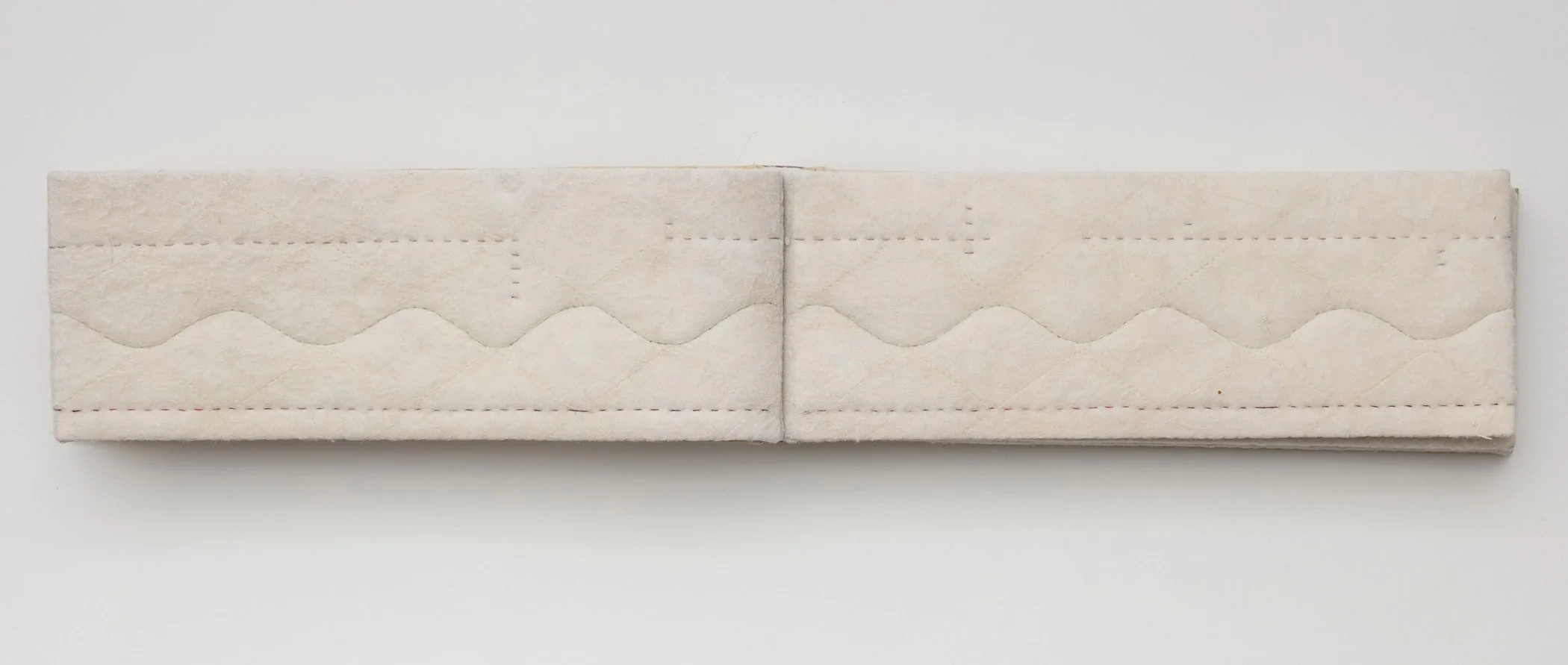 Rest(less) documents the sleep attempts of two middle-aged bed companions through a long, interrupted night. Two sleep “narratives” are stitched that trace the progression of the couple through multiple sleepings and wakings, their trials contrasted with a consistent, restful sleep-wave pattern. Utilizing the quilted cover and lining of a well-used pillow as its base materials, the book stands not only as a narrative of a particular episode but incorporates the physical and psychic traces of many restless nights.