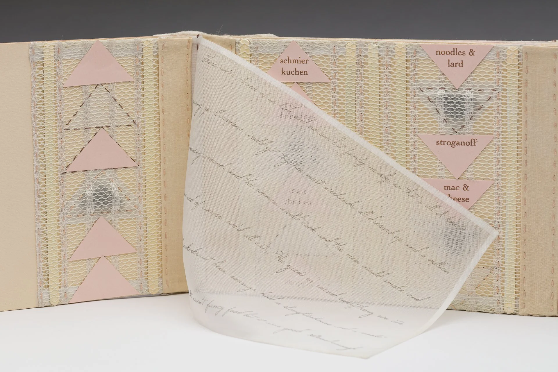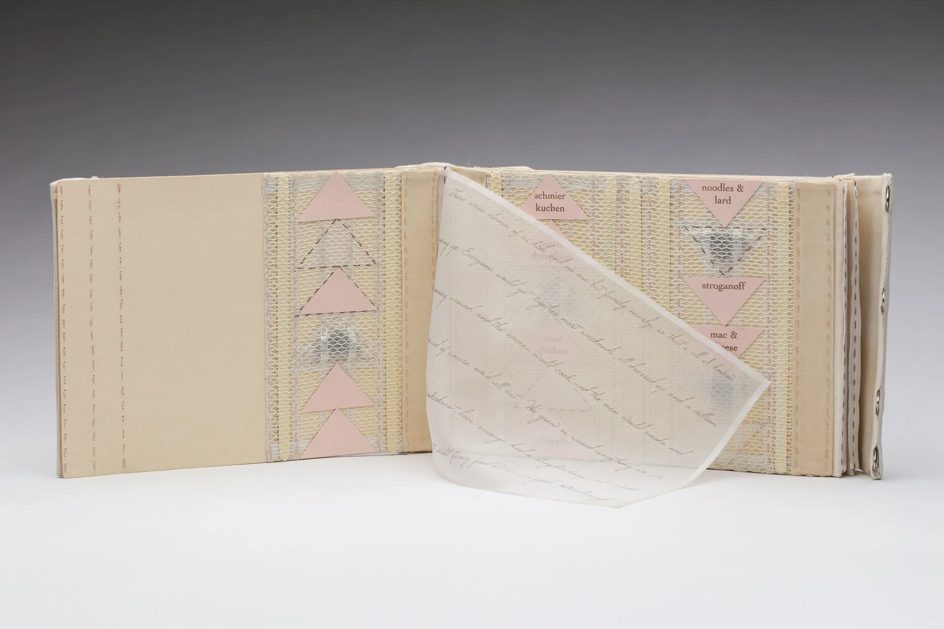 The book I made in response explores and enacts those tensions. The five narratives inside the book relate different women’s memories of eating and family, while their recalled familiar foods are printed on delicate pink triangles, laid out in a “wild goose chase” quilt pattern on a fancy lace. Amidst this femininity and nostalgia, however, is a rigid grip: pages are stitched tightly in multiple lines, steel boning and ball bearings are embedded in the lacework, a long list of “tips” for weight control is inscribed on the backside. When closed, the book is also held tightly together with corset bindings which must be assertively reckoned with before opening the book or viewing its contents.
