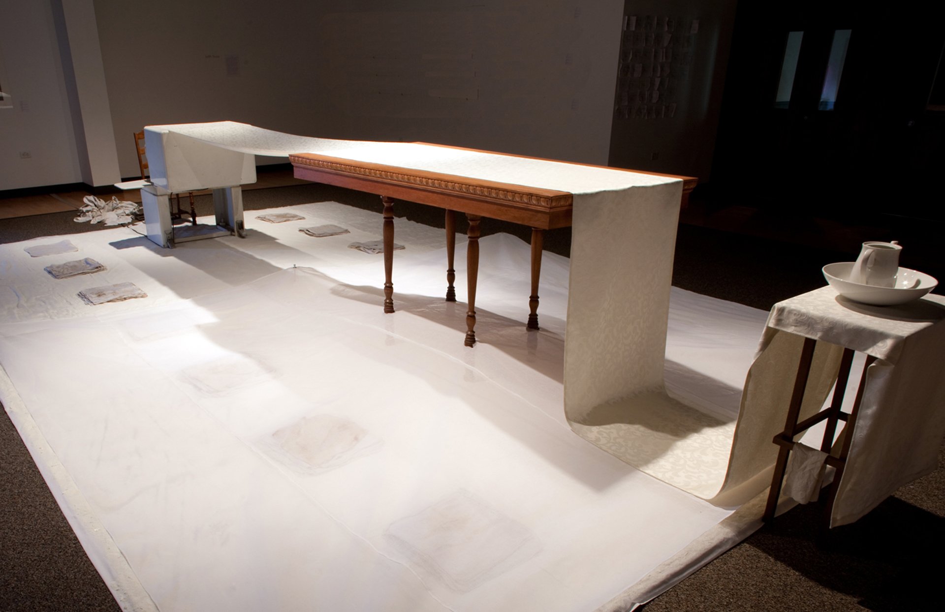 An Iron-Rite mangle is placed at one end of the Devotion installation. In the original setting, the floor is covered with an inch or so of Tide Free powdered laundry detergent, over sections of which is suspended a large, tightly-stretched, hemmed crinoline sheet a few inches above the ground, with grommets at the corners and bolts fastened to t-nuts that are embedded in undersheets of OSB board. Stretching from the back of the mangle across a long table is a wide runner of ivory damask fabric; this runner reaches and drapes over a small table with a porcelain pitcher and bowl atop. Several “stations” are positioned along the perimeter of the laundry soap, established by rags placed in the laundry soap. In subsequent settings, a long piece of red crepe fabric extends from the back of the mangle and up to the high ceiling, with a single egg resting on the floor under its canopy.