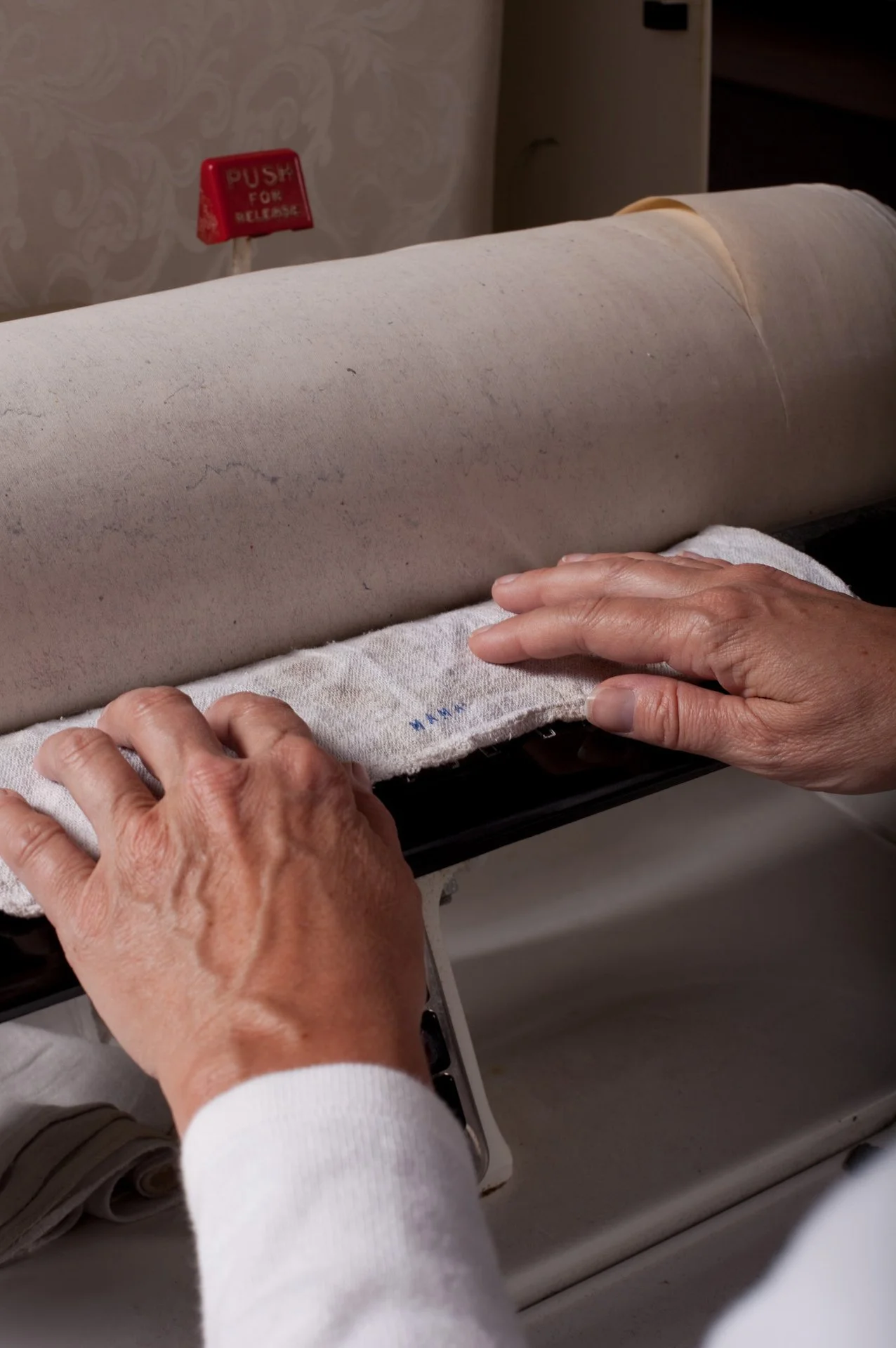 In preparation for Devotion, members of the Regis community participated by using designated rags to “mother” someone or something, returning them with their soil and stains. Dozens and dozens of rags were thus “marked.” Each day in the installation, women performing as “mothers” ritually processed individual rags through a mangle (a vintage home ironing machine), pressing the fabric and also heat-setting the stains. After pressing, the performer then placed the rag on the layer of laundry detergent covering the floor and knelt in devotion. The ritual concluded with the mother-performer washing her own hands, before returning to the mangle to repeat the whole process with the next marked rag. Several hundred rags were moved through the installation in this manner